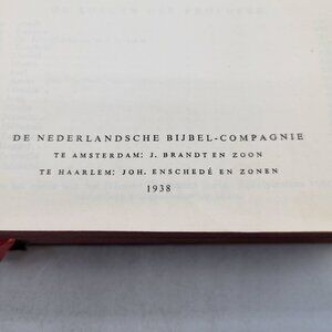 Inside title page translates to: BIBLE THE ENTIRE HOLY SCRIPTURE CONTAINING ALL THE CANONICAL BOOKS OF THE OLD AND NEW TESTAMENT BY COMMISSION OF THE HIGH MIGHTY LORDS THE STATES GENERAL OF THE UNITED NETHERLANDS AND ACCORDING TO THE RESOLUTION OF THE NATIONAL SYNOD HELD AT DORDRECHT IN THE YEARS 1618 AND 1619 FAITHFULLY TRANSLATED FROM THE ORIGINAL LANGUAGES INTO OUR DUTCH LANGUAGE BY THE DUTCH BIBLE COMPANY AT AMSTERDAM: J. BRANDT AND SON AT HAARLEM: JOH. ENSCHEDE AND SONS 1938