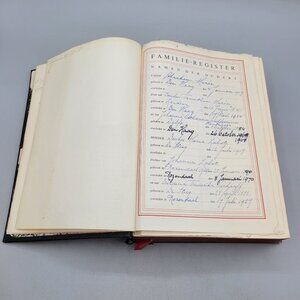 Condition - Slight scuffs on edges and corners, vintage wear is evident but minimal, inscription written inside front cover and family tree pages are completed. Tape on the inside back cover paper. Lots of wear to the leather dust cover.
