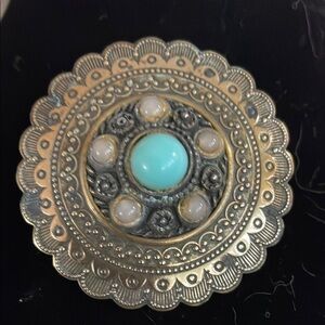 Vintage Elegant brooch with intricate gold detailing and a central turquoise stone. Perfect for adding a vintage touch to any outfit.