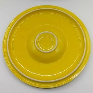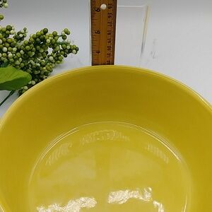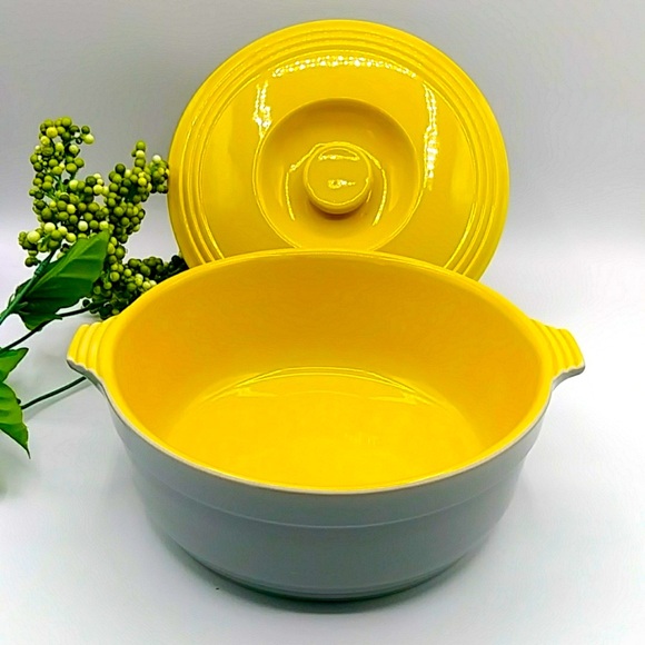 This Casserole Dish was sold by General Electric Refrigerators and it was manufactured by Hall Ovenware. It is a lidded 2 quart casserole dish with a bright yellow lid and interior. The outside of the bottom is a pretty light gray color. It has two handles on the sides. Very light gray streak on the inside. See picture. No chips or cracks, one little dot on the inside that missed being glazed- see picture. Really cute Vintage Ware. MCM. 1940s and 50s