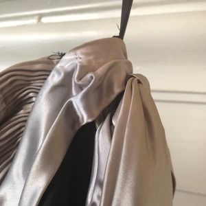 Late 1940’s full length silk and taffeta gown. It features shoulder straps and a side bow that wraps around the torso. The bodice has ruched silk which is slightly discolored but has a cool effect. The taffeta is also slightly discolored on the bodice. The rest of the dress is in good condition for its age. It fits around a 25" waist and 32 inch bust. Please inquire with any questions before buying.