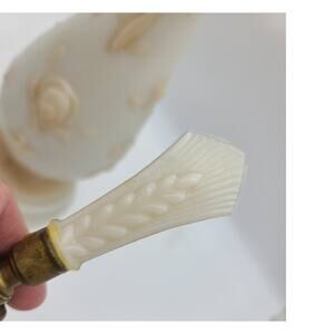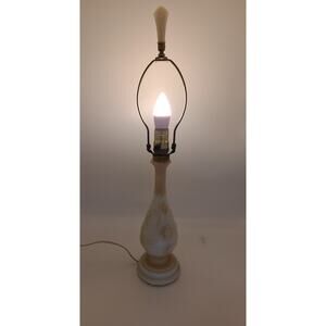 1940's ALADDIN Alacite Table Lamp. Alacite is a trademarked name for an ivory-colored opal glass developed by Henry Hellmers for the Aladdin Mantle Lamp Company, first produced in 1938. Does not glow under a black light, so lamp was made in the 1940-50's. The lamp is marked Aladdin. This table lamp has an ivory-colored opal stem, splashes of peach colored highlights, raised floral pattern, and lamp shade finial with raised leaf art deco style design. Measures 24" T with finial, w/o finial and harp 15". Base has 4 small feet. The socket piece has a screw on rim that attaches to the glass body at the socket. In very good working condition. No cracks, scratches or chips to the glass body. Finial is not chipped but the raised seam has some age loss, and glue to screw-on brass. Light fade to peach. Metal has light aging. Light socket is clean, bulb up to 60w, switch works, all original wiring (no fraying) and non-polarized plug. NO lamp shade/lightbulb included. Weight 2 lbs. 12 oz.