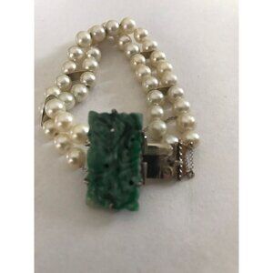 Vintage 1940's Double Strand Pearl Bracelet With Jadeite Clasp In 14 Karat White Gold