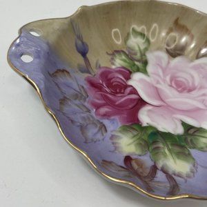 This beautiful pierced handle pink, white/pink roses, green/brown leaves hand painted over dual color periwinkle and tan, gold trimmed Bon Bon dish. Unique, and eye catching, this tray is perfect for nuts, nut shells, as a candy dish, Bon Bon Dish, trinket bowl or key tray. #NE20127B. Measures 6.5" handle to handle, is 5" in diameter, and stands 1.5" flat.
