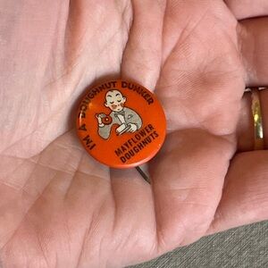 Showcase your love for donuts with this vintage 1940s Mayflower Donuts I'm a Doughnut Dunker celluloid pinback. Measuring at 7/8", this pinback is a unique collectible item that will add a touch of nostalgia to your collection. Made in the United States, this item is a testament to the country's rich history and culture.