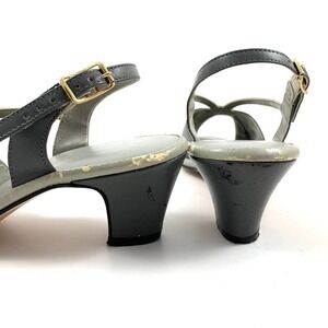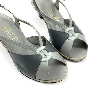 Vintage 1940's PENALJO gray color block heeled peep-toe sandals. Made in the USA. Good condition, some shedding to the edging of the soles and heels (see pics). Three shades of gray color block the whole sandal. Side strap is has adjustable buckle. Genuine leather. Padded soles. 2.5" block heels. Marked size 6 WW (wide). Ball width measures 3 3/8" wide.