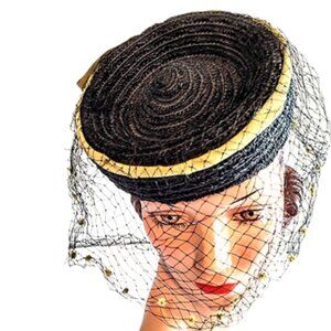 Original 1940s true vintage high style small round black straw tilt hat with a back band and chartreuse lime green ribbon trim and a full face veil.
