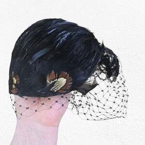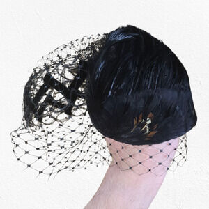 1940s Vintage Black Feather Fascinator Hat Veil Elegant Mid-Century Millinery