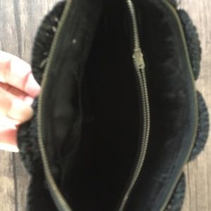 Black handbag with inner liner and three separate compartments, one that is zippered and works. Liner is in poor shape and the main zipper moves but does not lock the teeth of the zipper so it does not close.
