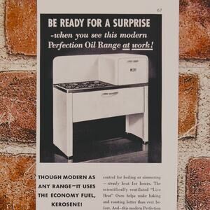 Step back in time with this 1940 Kerosene Oil Fuel Powered Kitchen Appliances Vintage Print Ad - 40s Modern Home Innovation
