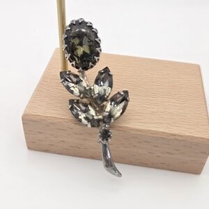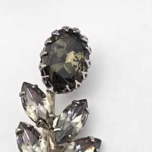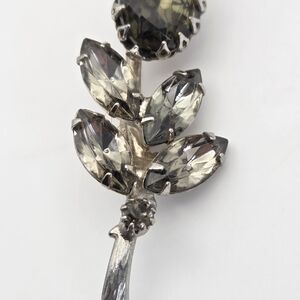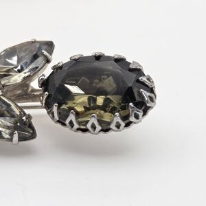 This amazing broach is from the 1940s. and features smoky green and smoky rhinestones set in a silver-toned metal base. It is in very good vintage condition with a little bit of patina on the back. It measures 2.25" high.