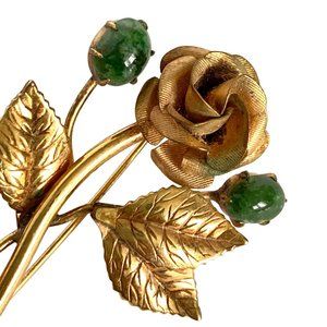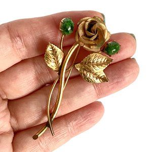 1940s Winard 12K GF Rose Flower Green Glass Stones Brooch Gold Tone 2.5in