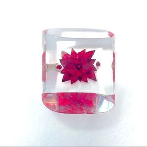 Approximately 1.75 x 1.75 x .50 inches. It has 2 loops on the back and the carving is exposed on the bottom, the color is a rich deep rose red.