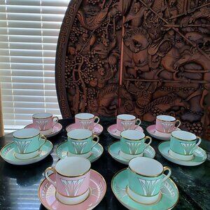 The colors on this set are beautiful. There are (5) pink tea cup and saucers and (5) seafoam green tea cups and saucers. The seafoam green tone has a very subtle aqua undertone. This set is trimmed in genuine 24k gold. The pink set is numbered 6341 on the back and the green set is marked 6142.