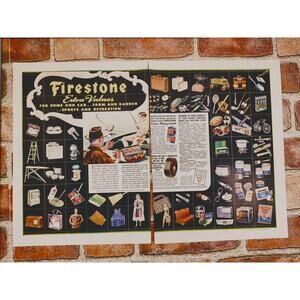 Step back into WWII-era retail marketing with this original 1942 Firestone 2-page print ad! This visually engaging advertisement showcases Firestone’s diverse product lineup, highlighting wartime necessities, household goods, and extra value offers. Bold illustrations, patriotic theme, and colorful design captures the wartime consumer experience and the importance of conservation and durability during WWII.