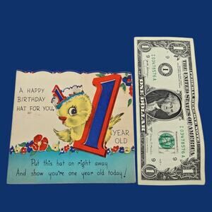 1942 Pop Up 1 year-old Birthday Hat Chick Duck Vintage Rust Craft Die-Cut Card