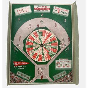 Original 1943 G.H. Anderson "The Major League Baseball Game" made in Cincinnati, Ohio. The advertisements on the cardboard gameboard all have patriotic messages in support of the WWII war effort. The cardboard part of the game with the spinner measures approximately 7" x 5.25" and the paper gameboard measures approximately 17" x 10" when unfolded. I was unable to find much information on this game and could only find one other example on the internet.