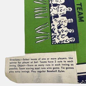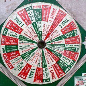 There is some wear to the paper field with some minor staining and small tears along the creases. There appears to have been some sort of pegs to track base runners but those are missing. Based on the one example of this game I was able find; I think there were also scoresheets originally included. No rips or tears to the cardboard gameboard. The spinner doesn't spin very easily. See pictures for further details on condition.