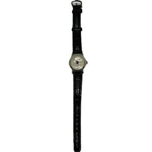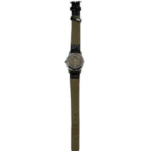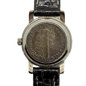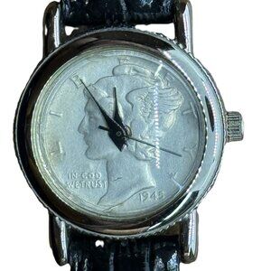 The 1945 Mercury Dime Dial Quartz Watch is a unique and vintage timepiece designed for women. Featuring a silver bezel, black dial, and a leather strap band, this custom watch showcases a 12-hour dial with a coin on the back. Made of stainless steel and powered by a quartz movement, this round watch exudes a casual style perfect for everyday wear. Its theme of coins and money adds a touch of charm to this classic timepiece. New battery, runs good. Not new but good condition