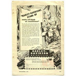 Vintage September 1945 Old Popular Mechanics HARLEY DAVIDSON Magazine Full-Page Print Ad. Tag line, STAND UP UNDER ALL KINDS OF CONDITIONS!