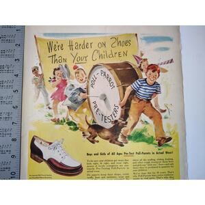 Cheerful Original 1946 full-page print ad for Poll-Parrot & Star Brand Shoes features smiling energetic children in a rag-tag parade marching band beating on a giant drum labeled “Poll-Parrot Pre-Testers” and sign "We're Harder on Shoes than Your Children"