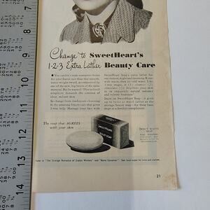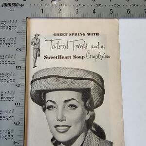 Original 1946 print ad for SweetHeart Soap showing a woman in a tailored hat and coat promoting a fresh complexion through “1-2-3 Extra Lather Beauty Care.”