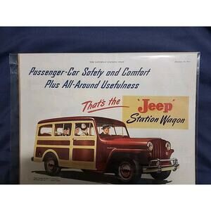 This vintage print ad showcases a 1947 Jeep Station Wagon by Willys Overland, manufactured in Toledo, OH. The colorful multi-color design promotes the original model with a theme of automobiles. The ad is an original piece created in 1947, making it a valuable collectible for Jeep and advertising enthusiasts. The type of advertising is a print ad, and it is a great addition to any collection of American automobile memorabilia.