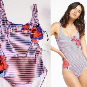ANTROPOLOGIE x ONIA Red Blue One Piece SMALL MEDIUM Floral Striped Slim Fit Features - Hibiscus Flower and striped pattern, Wide strap, Stretchable, Scoop neck, Fixed strap, Slimming, Fitted, Curvy, Bathing suit, Swimwear, Open back, Designed in NY, High cut leg, Cheeky