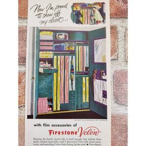 1950 Firestone Velon Closet Accessories Organized MCM Stylish Retro Vtg Print Ad "Now I'm Proud to Show Off My Closet"