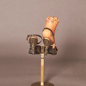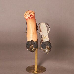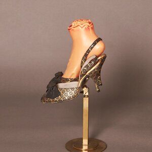 The shoes are in near mint condition, some discoloration on the bottoms, insole need regluing. They are a bright shiny gold metallic with black design and a big black bow on the front. Slingback and buckles on the side. Almond toe, mid heel. Made by Joseph Larose. Marked a size 5 M and measures 23.5 cm insole, 9 cm heel, 7.5 cm wide across bottom.