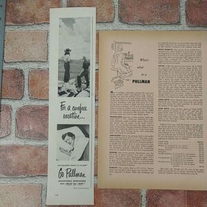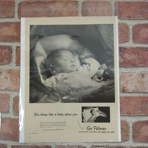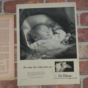 Sleep like a baby—even on the rails. This 1950 Pullman ad + article bundle features a peaceful baby and a woman resting in a train berth, highlighting the comfort and quiet of Pullman accommodations. With grayscale tones and postwar optimism, it’s a mid-size clipping perfect for junk journaling, nostalgic gifting, or gallery wall serenity.