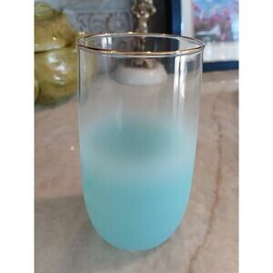 This is a vintage West Virgina Glass Company's Blendo water glass tumbler from the 1950s, known for its distinctive frosted ombre design and 24K Gold gold band.