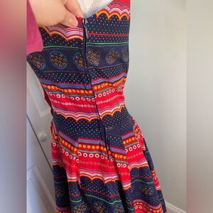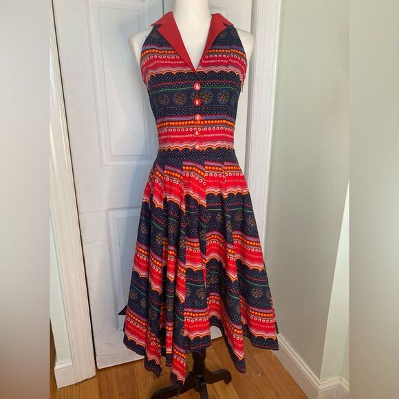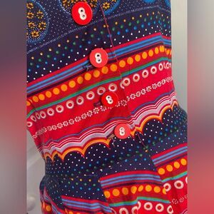 This stunning dress features a zipper on the side and buttons down the front. The bottom has been cut & sown to mimic that of a scarf skirt. A very unique and cool item. Two of the button's colors have faded slightly as pictured but it is otherwise in excellent condition.