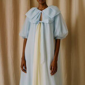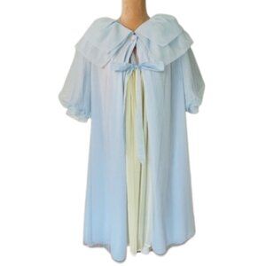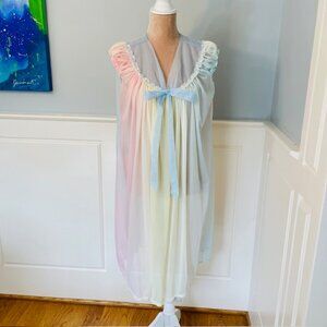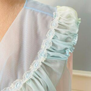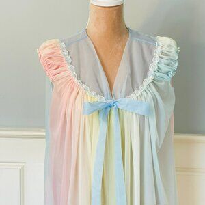 Vintage late 1950's - 1960's Peignor Set. St. Michael Voluminous double layer "bri" nylon chiffon. Ice Cream Dreamsicle Pale Blue, Pink, Yellow Rainbow Pastel Colors. Dramatic oversized double sheer chiffon platter collar, single button closure. Double layer all nylon, smooth over sheer chiffon, full A-line cut. Short puffed sleeves with a fitted cuff. Nightgown is vintage Etam, pull over style with front bow, v-neck accented with a line of floral appliques. Smooth semi sheer nylon with sheer neckline, gathered elastic cuff cap sleeves,