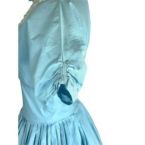 Adorable 1950s/60s blue cotton pleated day dress with sheer scalloped lace bib bodice. Panel waist and full skirt. Shirred shirt sleeves. Metal zipper up the back. No labels present. Shown with petticoat which is not included. It’s in good condition with the exception of a lightened area in the back of the skirt as shown.