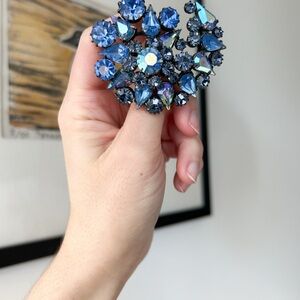 1950s unsigned brooch featuring blue and aurora borealis rhinestones, set on silver-toned metal. Measures 2.5’ by 2’
