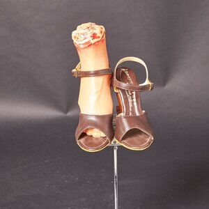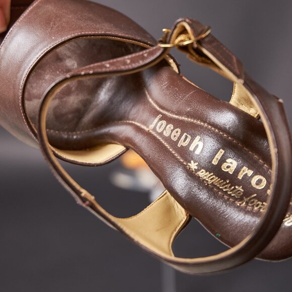 The shoes are in mint condition. The are a dark brown leather. The heels are a carved wood in shape of boomerang. Closes around ankle with w buckle. Made by Joseph Larose. Marked a size 7, but measures smaller, measures 23 cm insole, 9.5 cm heel, 7.5 cm wide across bottom.