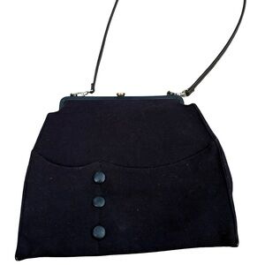 1950s Dark Blue Wool Felt Frame Bag w/ Scalloped Pocket & Covered Buttons