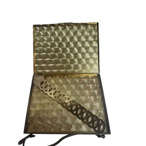 1950’s Double Sided Evan’s Metal Cosmetic Compact Gold tone Clutch With Handle. Shipped with USPS Priority Mail.