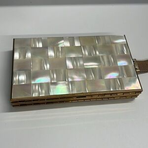 This is a stunning 1950’s Evans 5.25” x 3” Mother of Pearl Brass Vanity Case Clutch Wristlet. Mesh 5.5” strap is attached to a gorgeous double sided case. One side opens to a powder compact that is still has an almost full powder case, a small backside of a lipstick compartment that can be used for anything small and a card or currency clip. The vintage mirror does show a chip off the bottom as shown. The other side is open to anything you choose with a clip that can hold in place any other items like credit cards, etc. It will come in its original cotton bag.