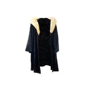 Vintage mid-century HY Goodman "just fine furs" authentic black astrakhan fur coat with mink fur collar. This piece is the definition of elegance and glamour. The body of the coat was made from authentic Persian lamb fur (astrakhan) which was very popular in the 1940s-1960s and became extremely hard to find by the 1970s. The fur has a distinct swirling texture, giving it depth and dimension. It fastens closed with two discrete black hooks and loops down the center front. The black astrakhan fur is complimented perfectly by the thick mink fur collar which can be worn down or popped up for extra warmth and drama. There are two slit pockets and the interior is fully lined with silky smooth black floral lining. The previous owners monograms are embroidered in the lining. The original hand woven and stitched in label is still at the back neck. It reads "Just Fine Furs HY Goodman Original". (A high end couture company based out of NY, USA). It has the famed boxy, flaring, a-line silhouette synonymous with old hollywood glam in the mid-century era.