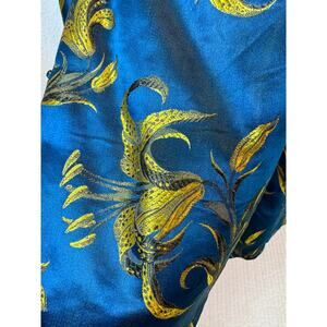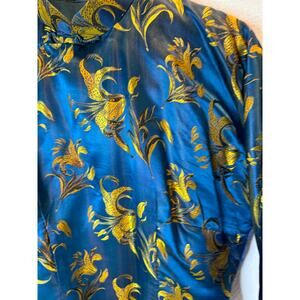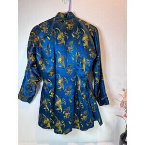 Embrace timeless elegance with this authentic 1950s hand-sewn Chinese silk brocade jacket. Showcasing a vibrant blue and gold floral pattern, this vintage piece features a quilted cotton lining for added warmth and comfort. The Mandarin collar, traditional frog closures, and tailored silhouette highlight its exquisite craftsmanship. Ideal for collectors, cultural events, or vintage fashion enthusiasts seeking a unique statement piece. Measurements: Pit to pit - 18”, Length - 28”. In excellent vintage condition with minimal signs of wear.