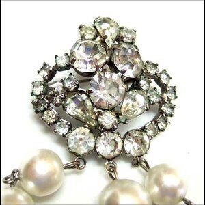 The brooch is in fabulous well cared for condition. There are no scratches or imperfections on the pearls. The silver metal loop wires are clean and bright. The RS orbs are perfect. All of the rhinestones are prong set, sparkling, and all are present with no chips or scratches. The silver rhodium is perfect both front and back and all of the prongs are perfect with no wear.
