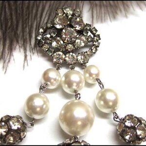This massive chandelier brooch is made of clear crystals, large pearls, and rhinestone orbs. The brooch is unsigned but this was a Hattie Carnegie book design. The top has a silver rhodium setting w Austrian crystals in a crown shape. The design features large faceted chatons & faceted pear cuts. All of the crystals are prong set. The crown has excellent quality old Austrian lead crystals with spectacular brilliance and diamond like faceting.