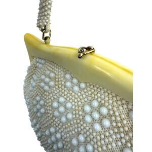 1950's JOHN WIND white beaded. All beads intact. Designer is John Wind. Fully lined. Outside of purse is in excellent condition, there is a tear in the lining inside (see photos). 12” x 7.5”.