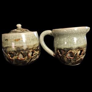 Charming mid-century Japanese pottery creamer and lidded sugar bowl set, made in the 1950s. Crafted with a green crackle glaze accented by earthy brown tones and pierced cutout heart motifs around the lower body. The sugar bowl includes its original lid with knob handle, and the creamer features a wide spout and sturdy handle.