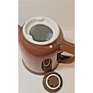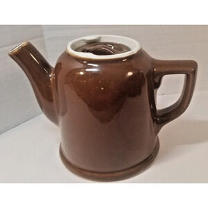 This is a vintage 1950's Mid-Century Modern Hall teapot in brown porcelain, measuring 6" in length and 4.5" in height. It is a single-serve teapot from the USA, featuring original design and production. The teapot bears the Hall brand, making it a collectible piece of vintage original restaurant ware. It is a stylish and unique addition to any tea or coffee lover's collection.
