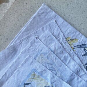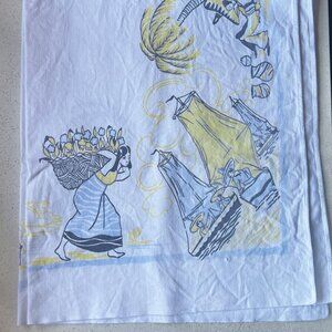 This vintage tablecloth captures a nostalgic tropical scene with vibrant sailboats, a flower vendor, and palm trees.