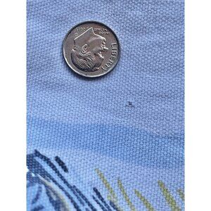 • Depicts tropical scene with palm trees, sailboats & flower vendor.