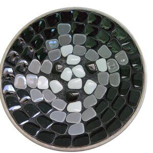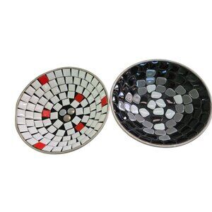 Vintage 1950s ashtrays featuring a striking mid-century tile mosaic design with durable aluminum backing. Each piece measures 5 inches in diameter and 1 inch in height, perfect for collectors or home decor enthusiasts looking to add a touch of retro charm to their space.